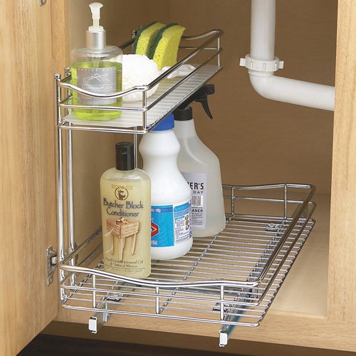 Lynk Professional Under, The perfect solution for those hard to reach spaces under the sink. Organize cleaning supplies, paper towels, trash bags and more. Top shelf has a removable liner for storing damp brushes and sponges.